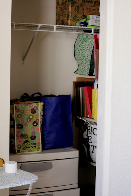 This particular closet stores things like Bumbo chairs, blankets and air beds.